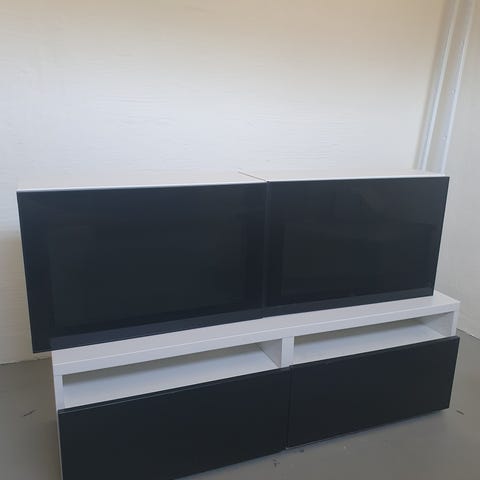 Vit förvaringshylla (60x40x202 cm) med en svart dörr och 2 svarta lådfronter. Vit TV-bänk (120x40x49 cm) med 2 svarta lådor. Löstagbar inredning för dvd i ena lådan. Perfekt skick. Även TV:n på bilden är till salu.
