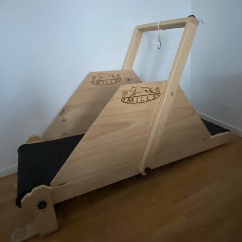 Man ligga under och hålla i handtagen som sitter på mitten av långsidorna så inte hunden kan komma in.