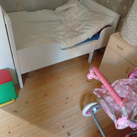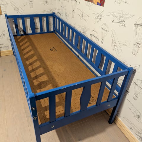 Sängen är som synes gammal och har några skavanker i färgen, men inget som påverkar funktionen. Äldre skumgummimadrass medföljer till. Ett roligt projekt för dig som gillar att fixa till, eller bara använda som den är.