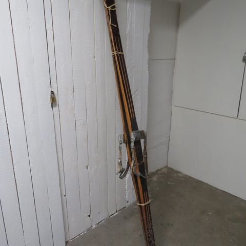 Ett antal äldre skidor i varierande storlekar. De flesta har tillhörande stavar. Äldre bindningar för långfärdsåkning.