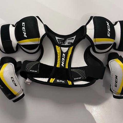Två st klubbor. En Warrior och en CCM, flex 55. 800 kr/styck (HÄMTAS PÅ PLATS). Axelskydd CCM 800 kr. Hjälm med galler CCM 1000 kr. Halsskydd CCM 100 kr. 2 Suspensoar 50 kr/styck Övningspuckar inomhus. Ljusgrön dribbling, mörkgrön, skott 50 kr/styck. Vill du köpa någon enstaka del så går det bra men helst säljer jag hela paketet. Pris för hela paketet: 2 500 kronor ALL UTRUSTNING HAR ANVÄNTS AV EN TJEJ. 168 CM LÅNG och 66 KG.