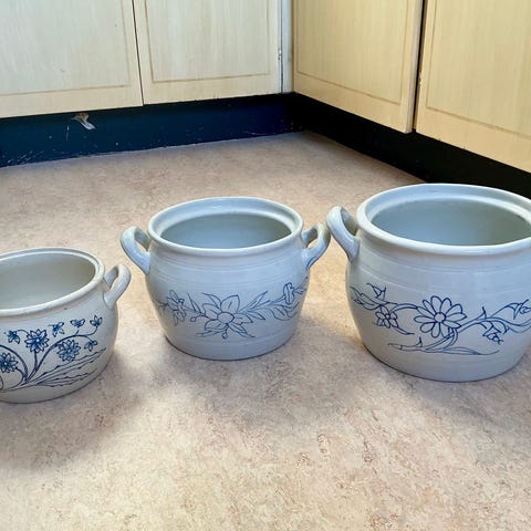 Den mörkbruna krukan är en Höganäs stengodskruka, 5 l.