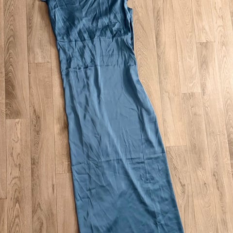 Oanvänd festklänning med tillhörande sjal. Draperad bål. Öglor finns på insidan om man önskar att sätta axelband. Fodrad. Blomman på framsidan går lätt att ta bort om så önskas. Fin lyster.