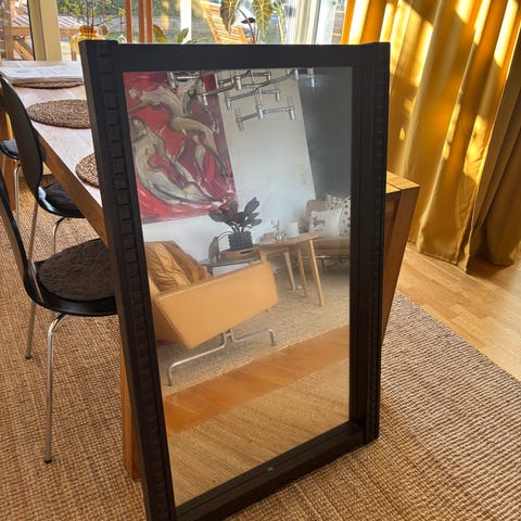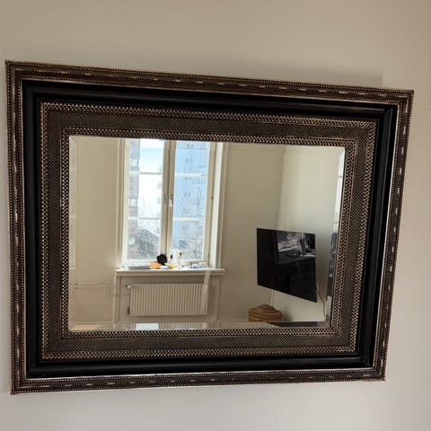 Spegeln är i nyskick med vit vacker ram med svart järnsmide.