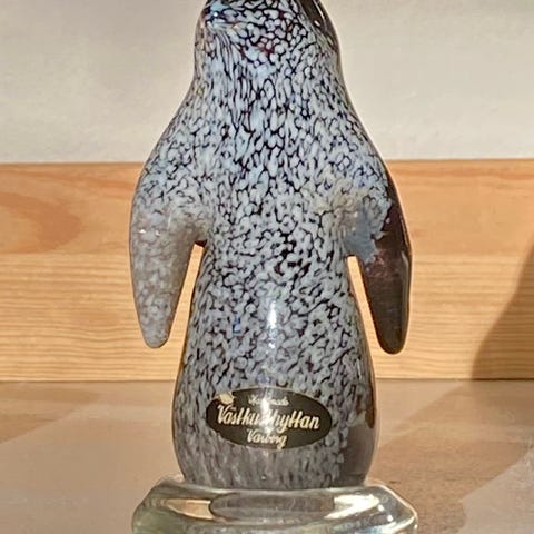 Annorlunda pingvin i akryl med lampor. Höjd 26 cm och bred 22 cm och djup 16 cm. Har elkontakt med sladdlängd 4,80 m. Kan användas inom- och utomhus. Utan kartong. Kan hämtas på Fridhemsgatan vid Fridhemsplan, Kungsholmen, Stockholm.