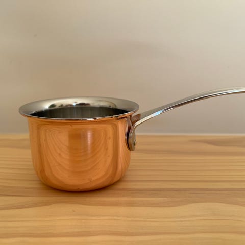Liten kastrull av rostfritt stål och kopparbotten, med ett nätt teakhandtag.