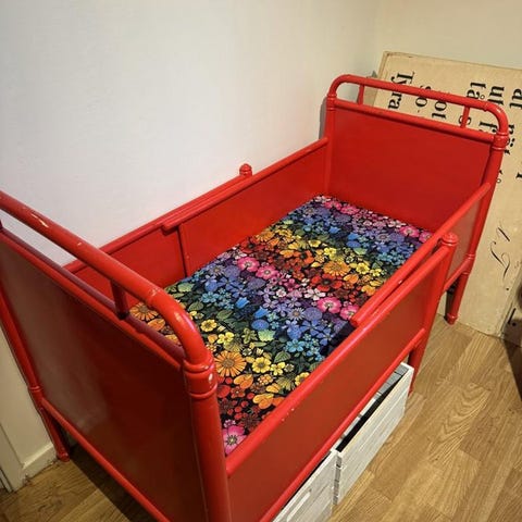Mycket fin utdragssäng i ek. Med kant så inte barnet rullar ut.
