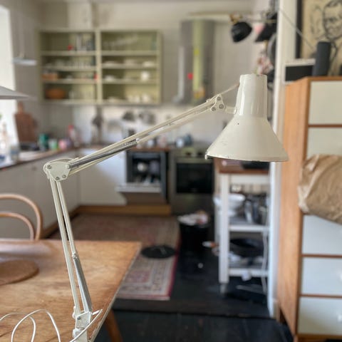 Retro, blå skrivbordslampa säljes.