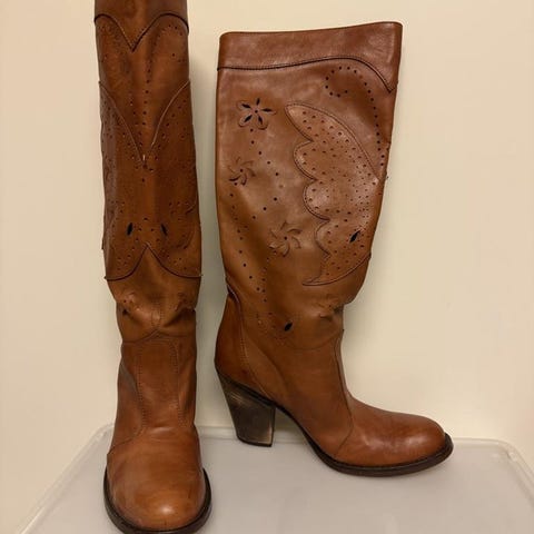 Bruna 70-tals stövlar i ABBA-stuk av läder.
