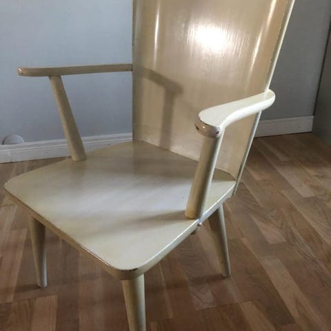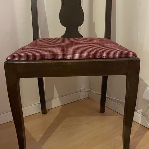 Stolen till höger: spricka i sits och rygg, visst spel i konstruktionen.