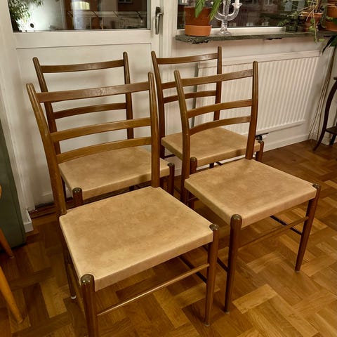 Tillverkade i furu och märkta ”Svensk Fur”. Klassiker från svenskt 1940–50-tal med det tydliga koniska ryggstödet och svarvade ben.