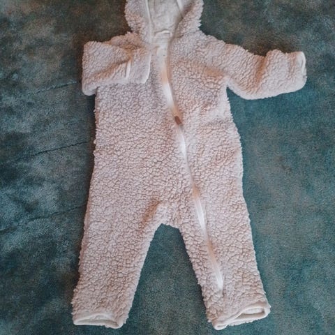 1 st gråvit mönstrad fleeceoverall stl 62 fr H&M, med strumpa, vikbara ”vantar”
