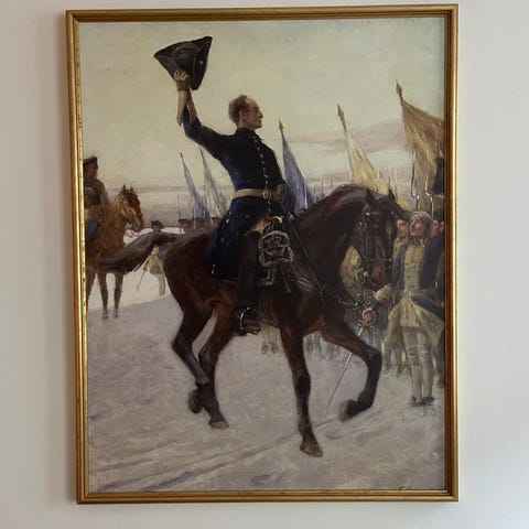 En äldre tryckt reproduktion av den historiska gravyren ”Norrmalmstorg” (nuvarande Gustav Adolfs torg) utförd av Johan Fredrik Martin (1755–1816) inkl ram. Motivet innehåller även Kungliga Slottet och Gamla Norrbro (riven 1797).