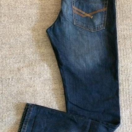 Byxorna har varit ihoprullade, därav lite veck, detta går såklart att stryka bort. Material: 100% denim(bomull)