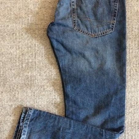 Sköna jeans, använda 2-3 gånger. Byxorna har varit ihoprullade, därav lite veck, detta går såklart att stryka bort. Material: 100% denim(bomull) OBS!! vänster framficka(insidan) har spruckit i sömmen, går såklart att sy...