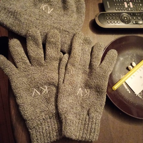 Grå dubbelstickad mössa med uppvikt kant och badge fram.