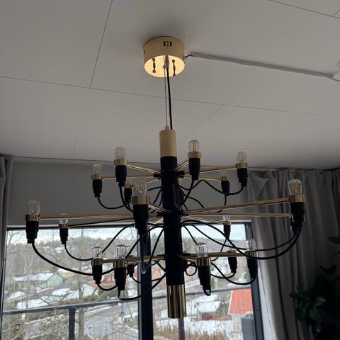 Svart ljuskrona med 6 ledade armar där glödlamporna kan vridas vågrätt eller lodrätt. Inköpt på Mio.