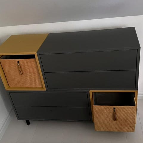 Sidoskåpet har fyra hyllor med gott om förvaringsmöjligheter.