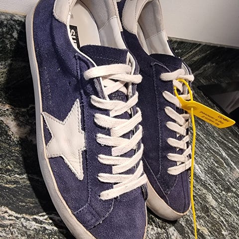 Golden Goose sneakers med dustbag. Skorna är i blå sammet, med svart stjärna på sidan. Storlek 41, men passar större. Har 42 i andra skor exempelvis. Var en present så därav inget kvitto!