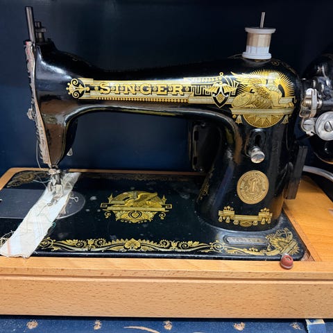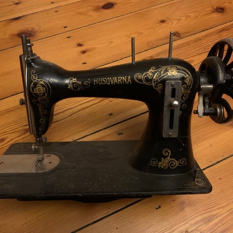 Fin gammal Singer-symaskin med fin tillhörande retro väska. Fick till mig när jag köpte den för mindre än ett år sedan att den fungerar. Har inte provat. Endast använts som prydnad.