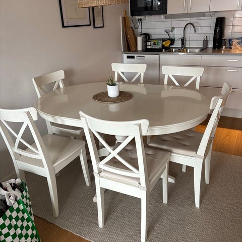 Vitt matbord från IKEA 1,40x 0,84 med två iläggsskivor 0,40. Totalt 2,20 m. 4 stolar.