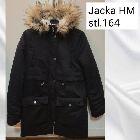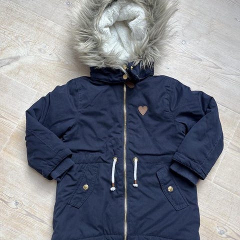 Fin, fodrad parkas från H&M i storlek 116. Blå med vitt, mysigt foder upptill. Avtagbar luva med pälskant. Två fickor med lock och tryckknapp framtill. Dekorativa, vita snören. Justerbar resår i midjan. Muddar i ärmslut. Stänges med dragkedja. Litet sprund baktill. Fint skick.