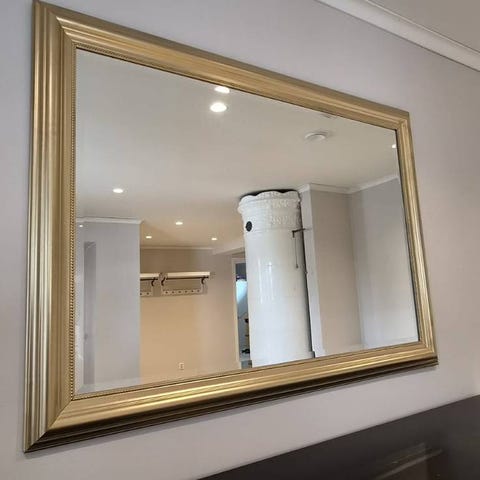 Rektangulär väggspegel med dekorativ smidesram. Spegeln har indelad spegelyta med smala ramar mellan rutorna och utsmyckade smidesdetaljer runt kanterna. Passar för upphängning på vägg i till exempel hall, sovrum eller vardagsrum.