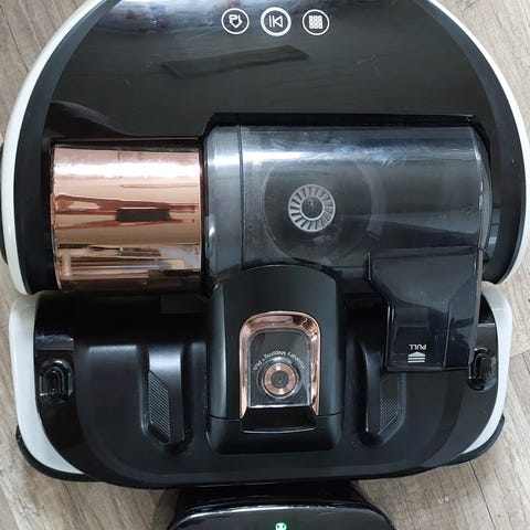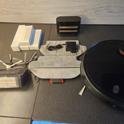 Robotdammsugare, laddenhet, 2 extra borstar, nytt filter (monterat i dammsugaren), bruksanvisning.