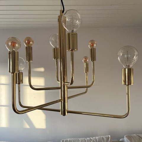 Enligt bild, taklampa i mässing utan ljuskällor. Bra skick! Kan eventuellt tas med till central del av Stockholm. Skickas ej.