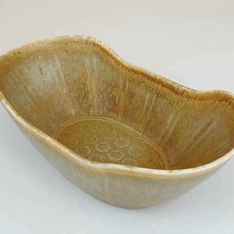 Föremålet på bilden är en vintage Gabriel Sweden stengodsskål. Keramikverksamheten, även känd som Gabrielverken eller Gabriel Keramik, grundades 1925 av krukmakaren Gabriel Burmeister i Timmernabben, Sverige.