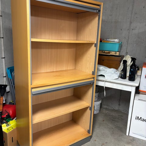 4 vita hylldelar varav 2 gavlar med hyllor åt mitten och 2 mittdelar med hyllor åt två håll. Hyllhöjd 150 cm Hylldjup cirka 40 cm i gavelhyllorna och 30 + 30 i mittdelarna.