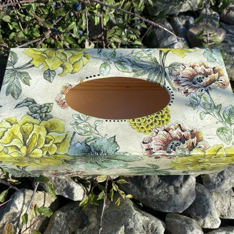 Din näsduksask behöver inte vara densamma som alla andras; ett vackert, köpt trälock räcker. Den här lösningen gör att näsdukar kan vara ett välkommet tillskott till vilket rum som helst, och fungerar som dekorativa accenter snarare än en tråkig kartong. Asken är tillverkad av barrträ och handdekorerad. Mått: längd, bredd och höjd: 25,5 x 13,5 x 9 cm.