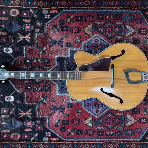 Tillverkad i Sverige, utan case. Enligt etiketten byggdes den för Anders Norlin och är daterad 5.8.1969. En lagad spricka i baksidan. Liten kropp.