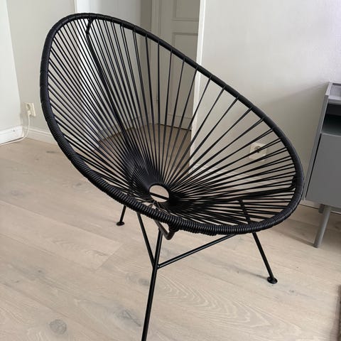 Säljer en grön stol i retrostil som kan användas som utomhusmöbel såväl som inomhus.