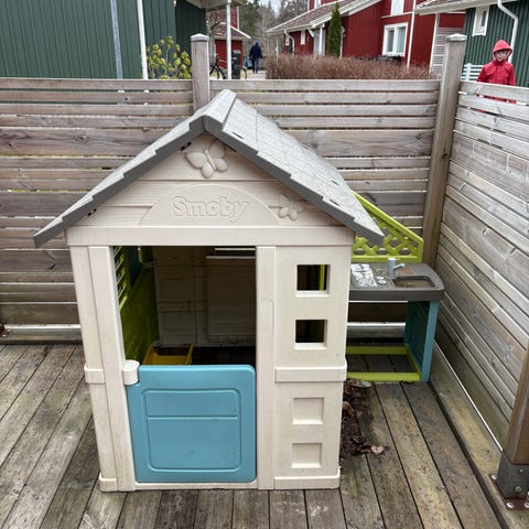 Lekhuset har endast stått inomhus och är i jättefint skick. Huset är lätt att ta isär för transport (monteringsanvisning/manual medföljer). Ihopsatt är huset 140 cm brett, 130 cm djupt och 161 cm högt. Största delen ser ut att vara gavlarna och de är 135 x 130 cm.