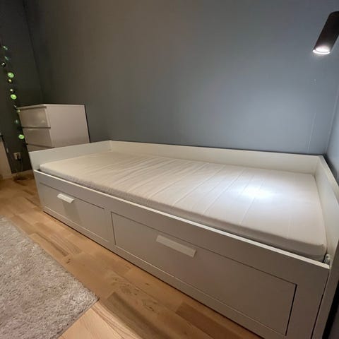 Dagbädden kompletteras med två madrasser, 80x200. De placeras ovanpå varandra när du använder dagbädden som enkelsäng, och bredvid varandra när du bäddar ut till dubbelsäng. Madrasser ingår.