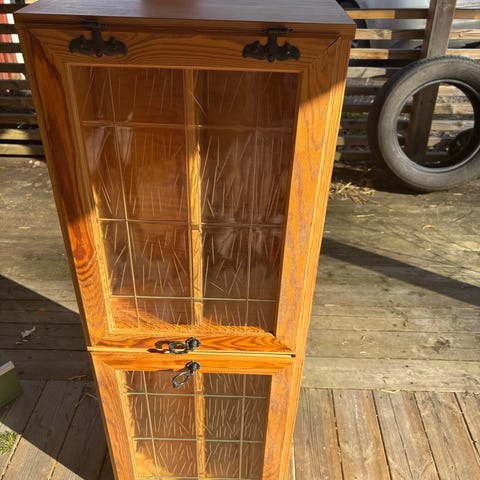 Svart med skjutluckor, överdel i vitrin.