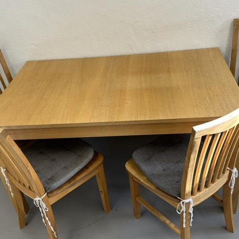 Stort matbord tillverkat i trä med rektangulär form och rundade hörn. Bordet har en naturlig träfinish och är lämpligt för matsal eller kök. Passar för flera sittplatser och har en robust konstruktion.