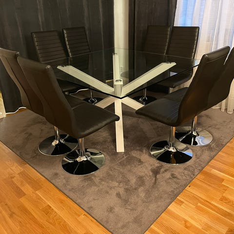 Säljer detta fina bord utan några skador. Stolarna ingår. 6 stolar. Skriv vid intresse och vid fler bilder:) mått: 150x150. Ca 75 cm i höjd. Se till att ta med bärhjälp