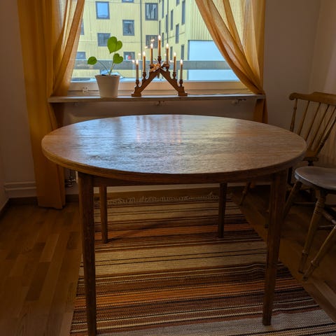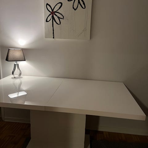 Köksbord som kan förlängas med iläggskiva. Osäker på måtten. Uppdatera annonsen imorgon.