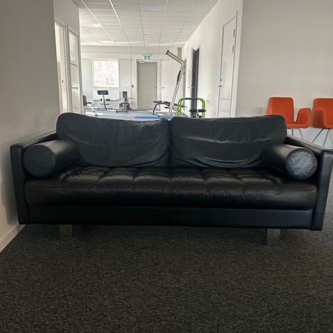 Fin lädersoffa köpt på bukowskis. Tjock svart läder. Mio troligen 50 eller 60tal. Dunplymåer. Bra skick för att vara över 50år. Luktar inget. Från ett rökfritt hem.