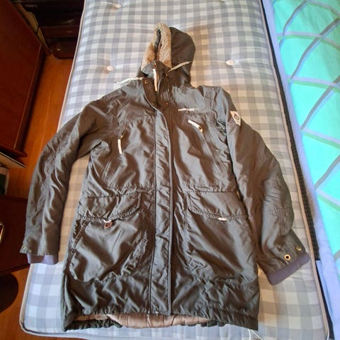 Didriksons Övriga ytterkläder i färgen grön, damstorlek 44. Jackan är vadderad med en quiltad design och har en huva. Materialet är anpassat för utomhusbruk med detaljer som resår i ärmslut och dragkedja framtill. Passar för användning vid kallare väder.