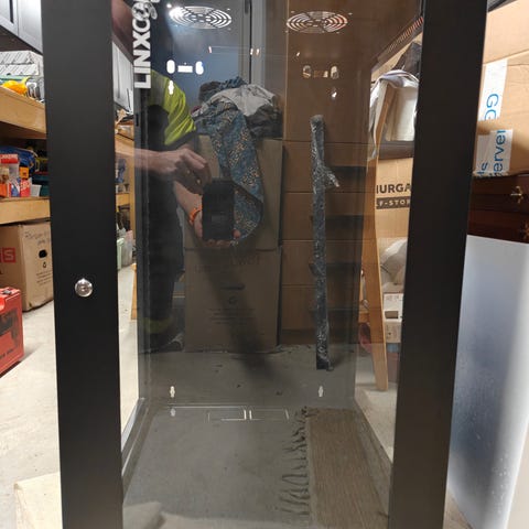 Rittalskåp i metall med glasdörr (tonat glas)