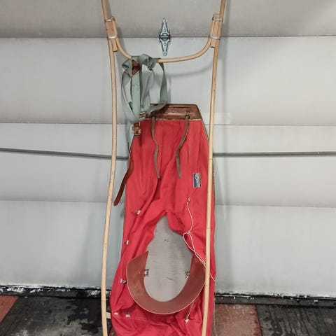 Träsläde för barn i trä med naturfärgad finish. Pulkan har en klassisk design med slädar av trä och metallbeslag. Passar för barn att åka i på snöiga underlag.