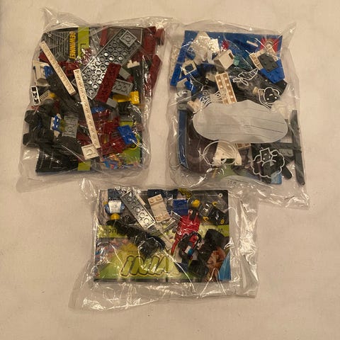 En hel låda Lego med delar tre olika staser.