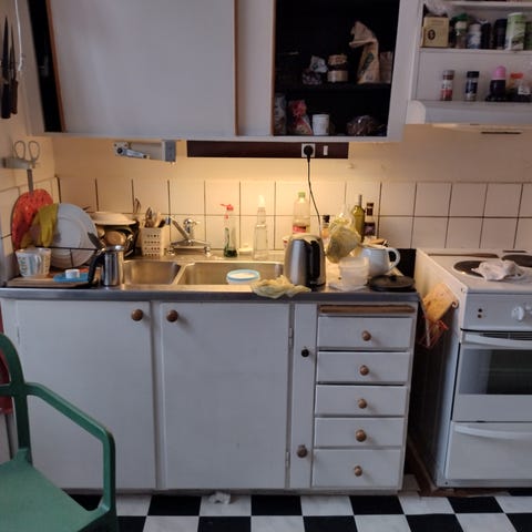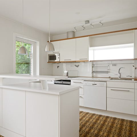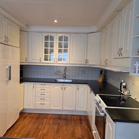 Fint original funkiskök från 40/50-tal - med de klassiska snedställda överskåpen och originalbeslag. Köket är i fint skick och har kvar originaldiskbänk i rostfritt stål med blandare från Strand.