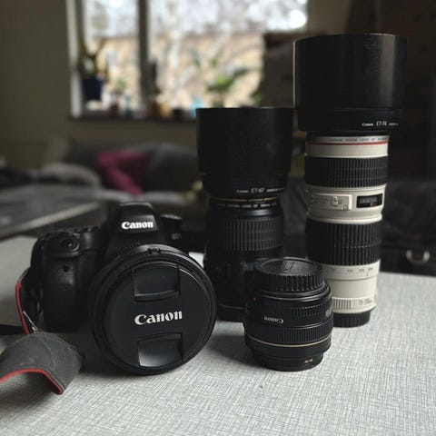 Canon kamera, objektiv och Manfrotto stativ