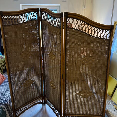 3 skärmar av vit snidad metall. Behöver lite kärlek, färg och tyg eller vad man vill ha. 1 av benen är tillböjt se bild 3. Varje del är 48,5 cm bred, höjd 172 cm.