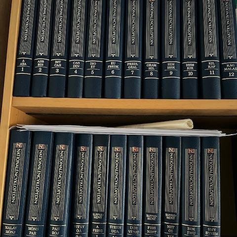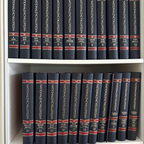 Nationalencyklopedin är ett uppslagsverk bestående av flera hårda blå band. Serien innehåller faktaböcker med information inom olika ämnesområden. 28 band.