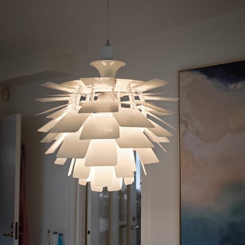Handgjord "blomtaklampa" skapad av kräppapper. En unik inredningsdetalj som ger ett mer personligt uttryck i hemmet.